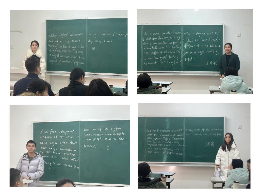 学院于2024年3月2日上午9点在3号教学楼112教室对29名新入职教师进行了第一项教学基本功考核。第一项教学基本功考核,主要围绕英文朗读和板书设计两项基本技能进行。新入职教师以饱满的热情和专业素养,依次上台展示。他们在朗读环节,发音清晰,语调抑扬顿挫;在板书环节,书写规范、字体清晰,充分展示了青年教师的专业素养和良好的专业功底。评委老师们以高度负责的态度和严谨作风,现场打分,确保了考核的公平、公正。