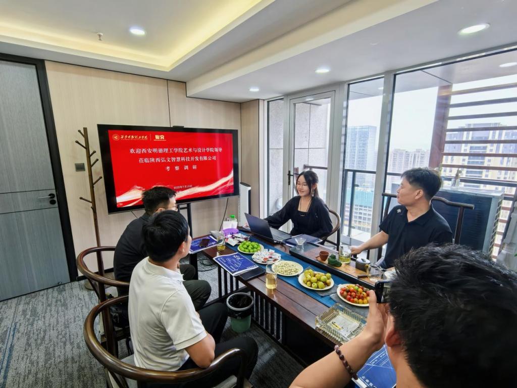 在陕西弘文智慧科技开发有限公司,学院访企老师在公司总经理韩文宏、办公室主任宫月陪同下,深入考察了企业依托数字技术打造的文化创意应用场景与创新研发平台,直观感受了数字技术在文化保护、传播与创新中的强大驱动力。座谈中,双方聚焦数字时代下的人才需求变革展开热烈讨论。影视摄影与制作专业负责人朱宇表示,当前高校人才培养与社会需求匹配度有待提升,需通过校企协同搭建产教融合平台,精准打通人才供给与产业需求平台,全面提升育人质量,精准职业规划引领。数字媒体艺术专业负责人肖瞳则提出,双方应积极探索横向课题的合作路径,将产业一线的真实需求与前沿技术难题引入高校科研与教学体系,促进人才培养与行业前沿动态接轨,实现校企资源互补、优势协同的双向赋能。