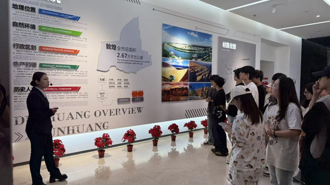 抵达敦煌后,考察课程便以丰富多元的形式有序展开。专业教师带领学生们走进敦煌市规划馆,在现代化的展陈空间中,通过动态沙盘、数字影像等科技手段,全方位了解敦煌城市发展的脉络与规划蓝图。从城市格局的演变到文化遗产的保护与利用,学生们直观感受到敦煌在传承中发展、在创新中守护的发展理念,为后续的文化探索奠定了宏观认知基础。