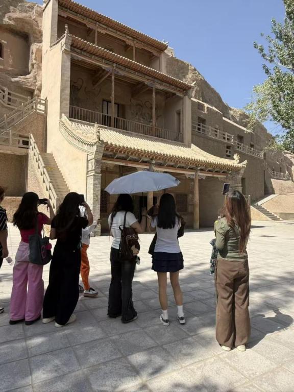 目前,这场文化探索之旅仍在继续。接下来的行程中,师生们还将前往榆林窟——这座被誉为“莫高窟姊妹窟”的艺术宝库,探寻更多未被广为人知的壁画珍品;走进鸣沙山月牙泉,在“沙水共生”的奇景中感受自然与人文的交融,从大漠风光中获取简约、大气的设计灵感。