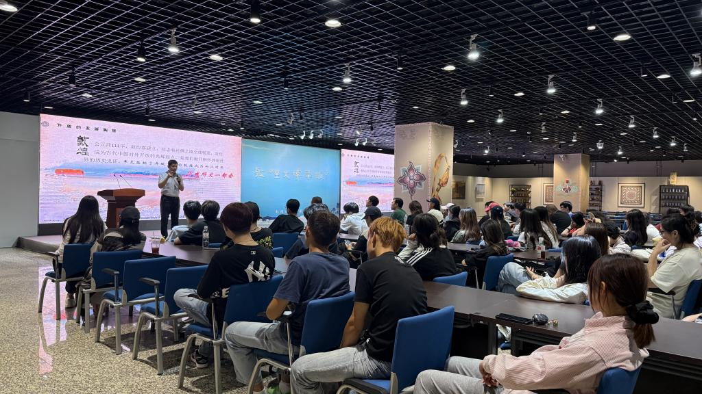 随后,一场干货满满的学术讲座为考察之旅注入了深度内涵。敦煌市博物馆副馆长张春生教授以《敦煌文化的当代启示》为题,用生动的案例、详实的史料,从敦煌艺术的风格演变、文化内涵到其在当代设计、文化创意领域的转化应用,为师生们带来了一场思想盛宴。讲座中,张教授特别提到敦煌壁画中的色彩搭配、纹样设计对现代产品设计的借鉴意义,引发了学生们的热烈讨论,让大家深刻意识到,敦煌文化并非遥远的历史符号,而是可与当代设计紧密结合的鲜活素材。