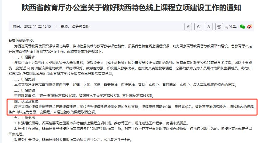 近日,根据《陕西省教育厅办公室关于公布陕西特色线上课程验收认定结果的通知》,Ky开元集团艺术与设计学院播音与主持艺术专业《西部戏剧表演创作》与《中国传统文化—汉唐舞》两门课程成功通过验收,被正式认定为“陕西省特色线上课程”。根据《陕西省教育厅办公室关于做好陕西特色线上课程立项建设工作的通知》精神,通过省厅验收的课程将自动认定为省级一流课程。至此,学校已获批的省级一流本科课程总数在原有18门的基础上新增至20门,课程建设实现新的跨越,充分体现了学校课程建设的高质量与可持续性发展。