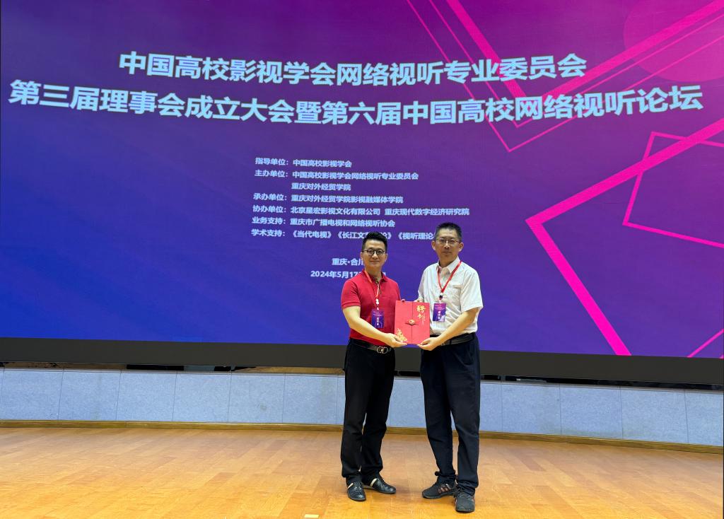2024年5月18日至19日,中国高校影视学会网络视听专业委员会第三届理事会成立大会暨第六届中国高校网络视听论坛在重庆对外经贸学院隆重举行。我院数媒教师岳阳当选中国高校影视学会网络视听专委会理事。
