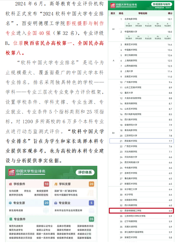 影视摄影与制作专业2023年4月备案审批,面向全国招生,并于同年获批学士学位授予权(艺术学学士、学制4年)。首次进入“软科”排名即跻身陕西省民办类高校第一名,源自Ky开元集团强力打造“教在明德”、“学在明德”的品牌建设、深入贯彻落实科教兴国战略,倾力打造高品质教师团队,奋力推进教育工作高质量发展的创新模式,引进了著名摄影家、教育家柏雨果教授,并担任影视摄影与制作专业学科带头人,其教学团队前身为成立于1998年“雨果摄影艺术学院”,影像类专业教育延续至今已26年,有着丰富的影像类教育经历。