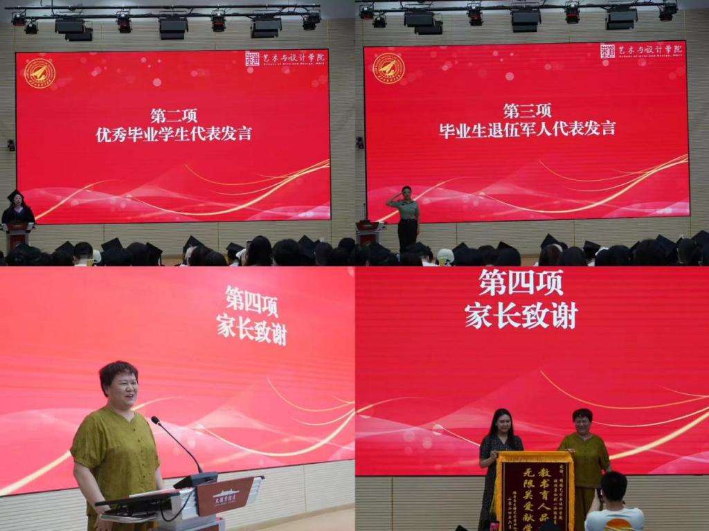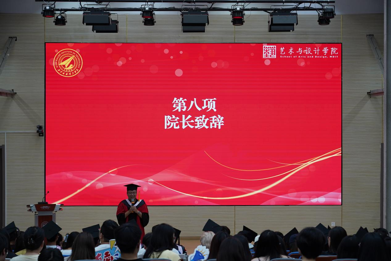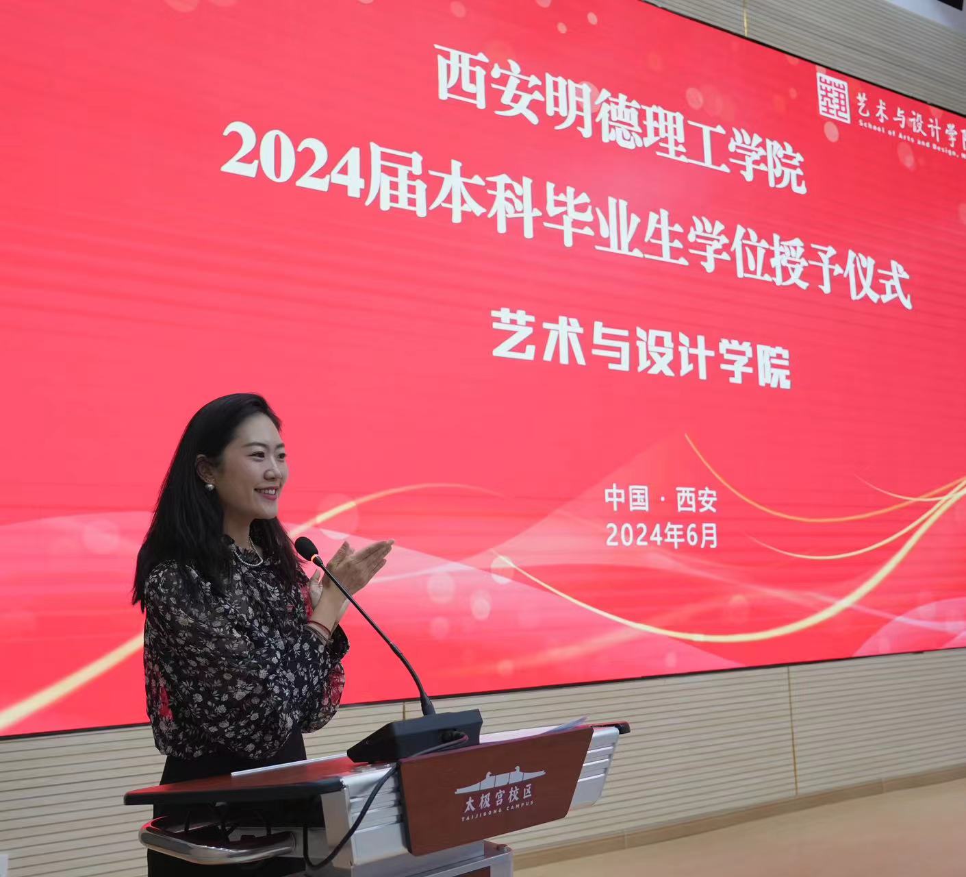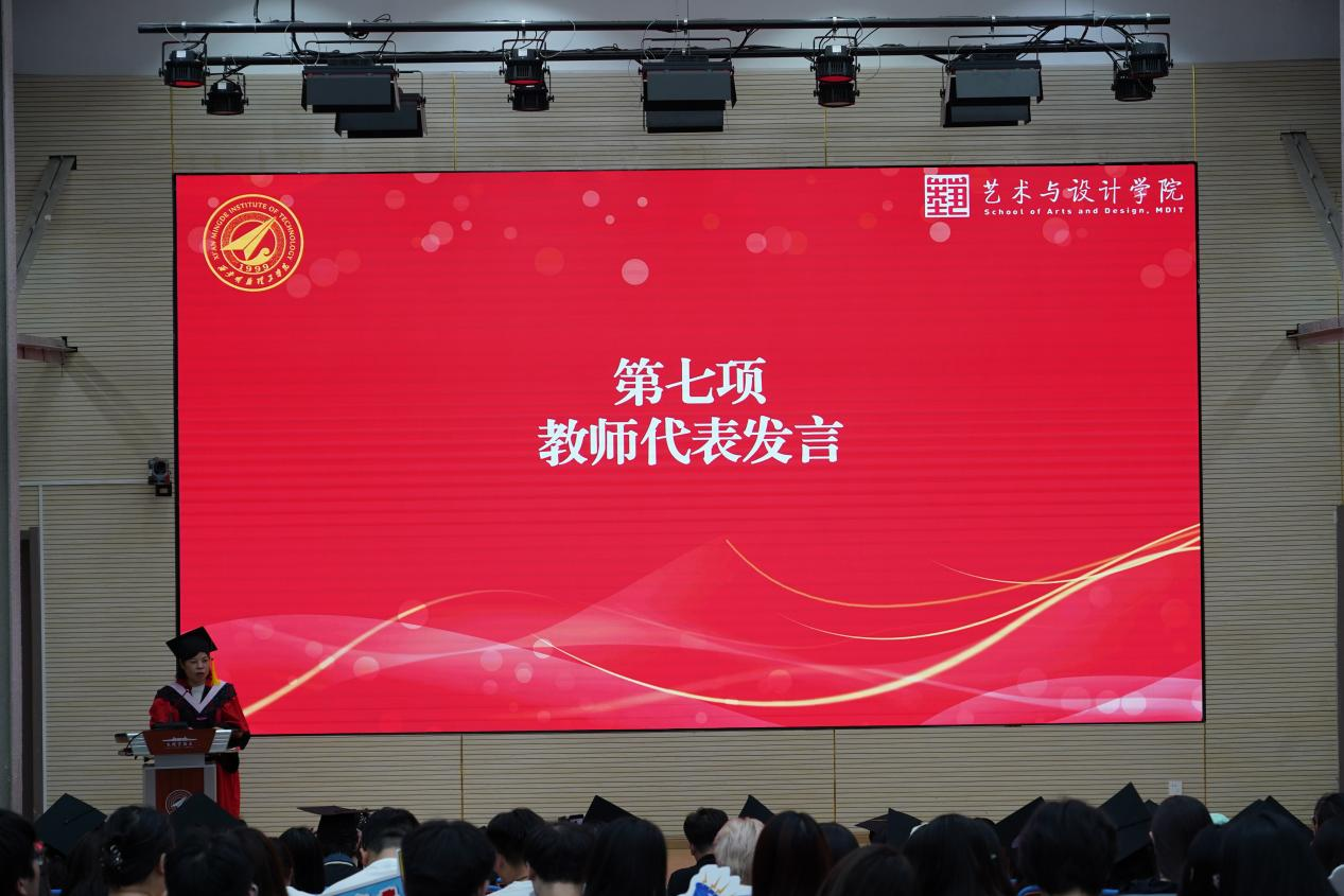 教师代表舒粉利老师祝贺各位毕业学子毕业快乐,即将迈入新的人生阶段,同时也代表艺术与设计学院全体教师感谢毕业生们的一路相伴。希望同学们永葆好奇心和求知欲,勇敢地去尝试、去探索、去验证,在探索与实践中成长。希望大家在毕业后能继续保持对艺术的热爱,一直践行“明德、亲民、至善”的校训,在未来人生路上能坚毅面对人生逆境和挑战,用更加昂扬的斗志去迎击。