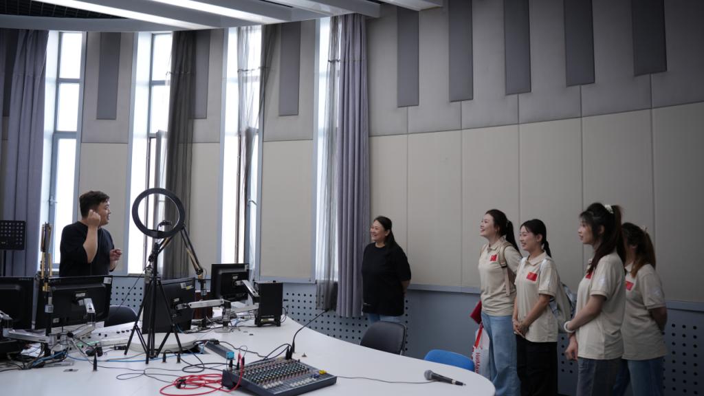 在乌鲁木齐电视台导演高萍老师的带领下,学生们通过实地考察、观摩、咨询和见习,了解新型传媒单位组织架构、采编流程、技术特点和宣传纪律,观摩优秀播音主持人的现场直播、录制节目等方式,了解了各个工作区域,包括播音室、导播间和编辑室等,明确了节目从策划、录制到播出的整个流程。深入了解声音艺术的魅力,有助于播主师生们更好地理解和掌握声音艺术,提高自己的综合素质。