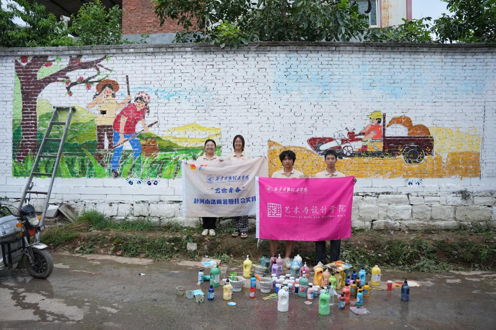 “艺绘青春·助力新村”暑期社会实践墙绘队为洛阳偃师夹沟村村口墙面进行绘画工作,覆盖墙面约36平米。宽阔干净的道路两旁,色彩各样的墙绘格外引人注目。路过的村民纷纷驻足,有的还拿起手机拍照。