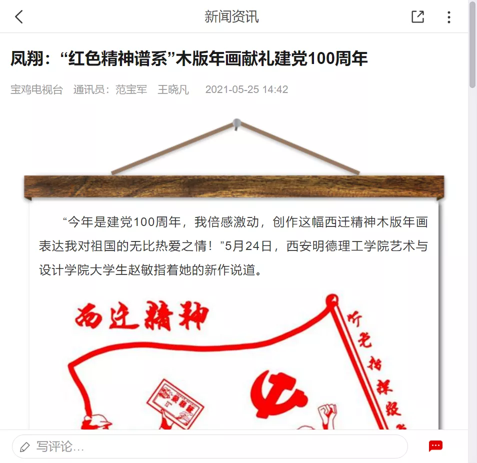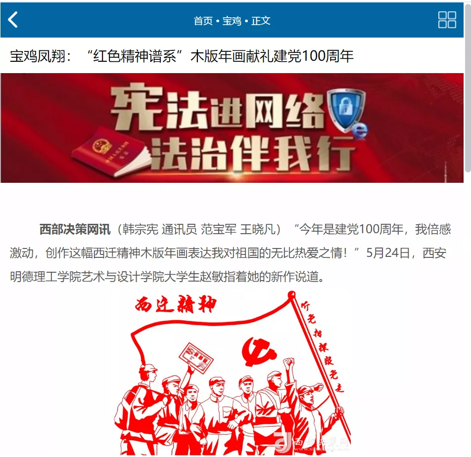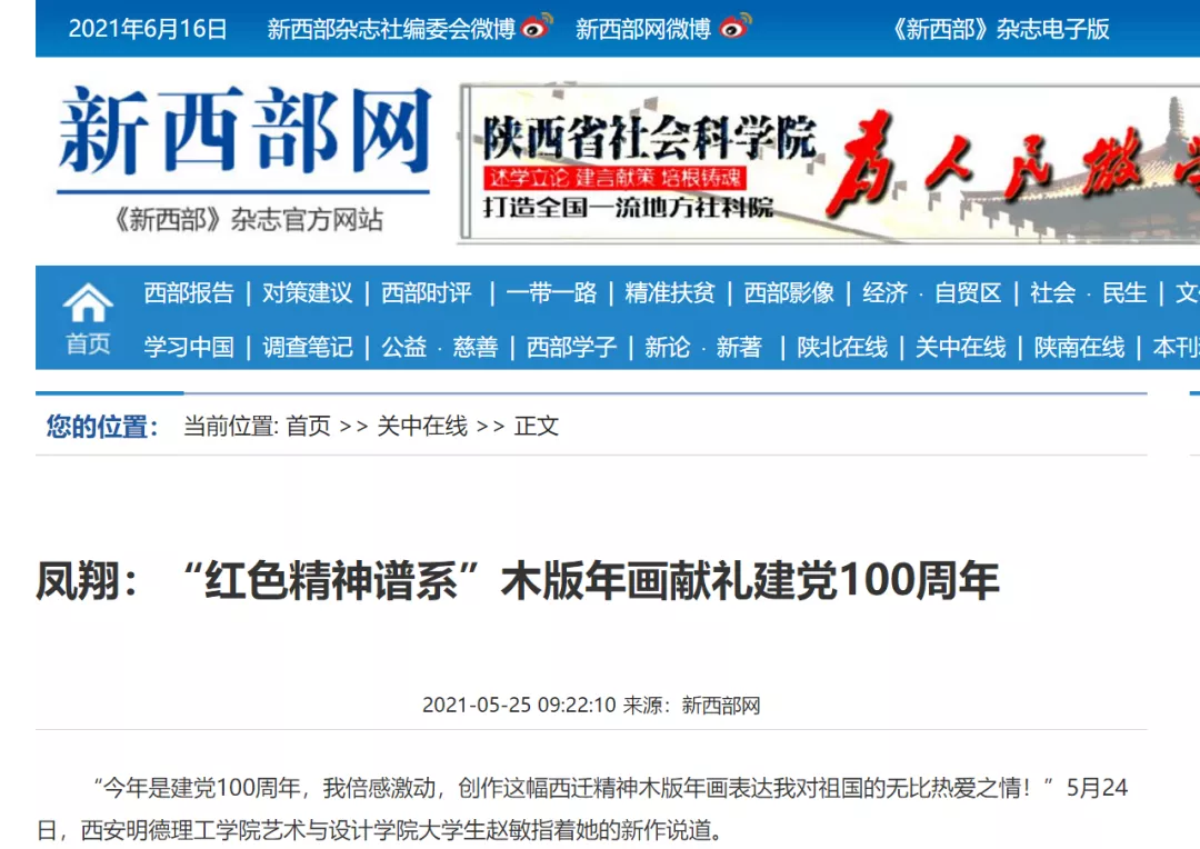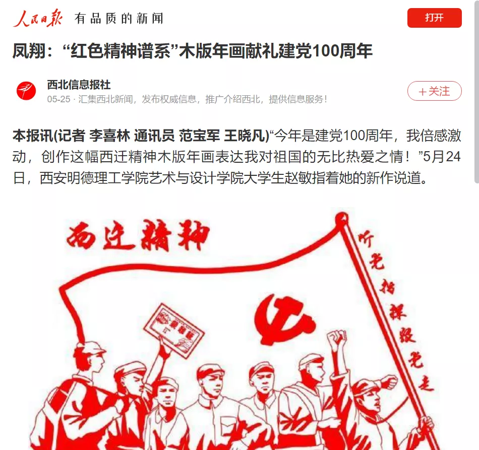为庆祝中国共产党百年华诞,开元师生以凤翔木版年画的风格,设计纂刻出了20余个精神谱系,以这种形式集中展示中国共产党百年历程中形成的伟大精神,取得的伟大成就,让师生在实践中感受中国共产党的精神伟力。开元师生创作的“红色精神谱系”木版年画受到了人民日报客户端、陕西日报客户端、西安发布、阳光网、网易新闻、宝鸡电视台、宝鸡日报、《新西部》杂志等媒体的广泛报道。