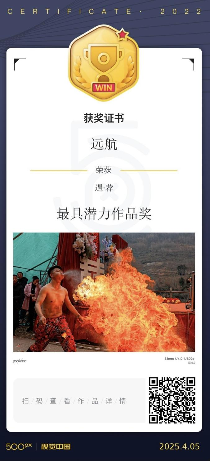 Ky开元集团艺术与设计学院数字媒体艺术专业2022级学生杨远航的摄影作品《烈焰舞者》荣获“3月遇·荐摄影大赛”“最具潜力作品奖”。该活动由视觉中国500px摄影社区主办,投稿数达25195份,仅有3人获奖。