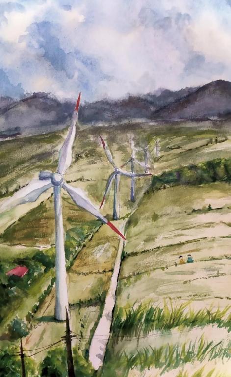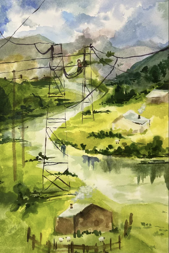 水彩画洁白的输电塔线条简洁,于青山绿水间傲然挺立,银线纵横延展。近处身着醒目工装的工人,是电力人敬业坚守的缩影。蓝天白云与葱郁大地相衬,既展现电力设施之雄伟,也寓意着电力事业在自然间稳步迈进的征程。