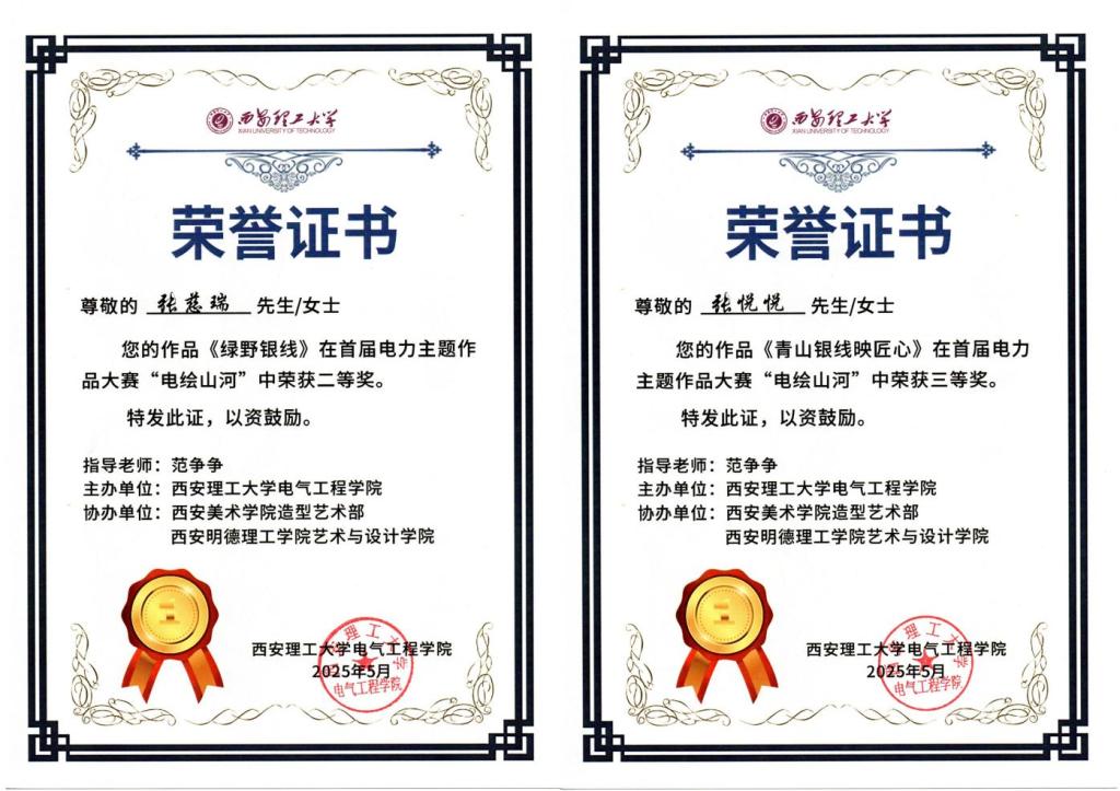 本次大赛自4月份启动以来,艺术与设计学院师生精心备赛。视觉传达设计专业教师范争争悉心指导,孙灿灿、张慈瑞、张斯琦、张悦悦、程晓5名学生以扎实的专业功底和创新的设计理念,在众多参赛作品中脱颖而出,荣获佳绩。艺术与设计学院学生以笔墨丹青为媒介,用一幅幅精美的作品勾勒出新中国成立以来电力行业发展的光辉历程、辉煌成就以及宝贵经验,彰显了学院在艺术设计领域的教学成果与实践实力。