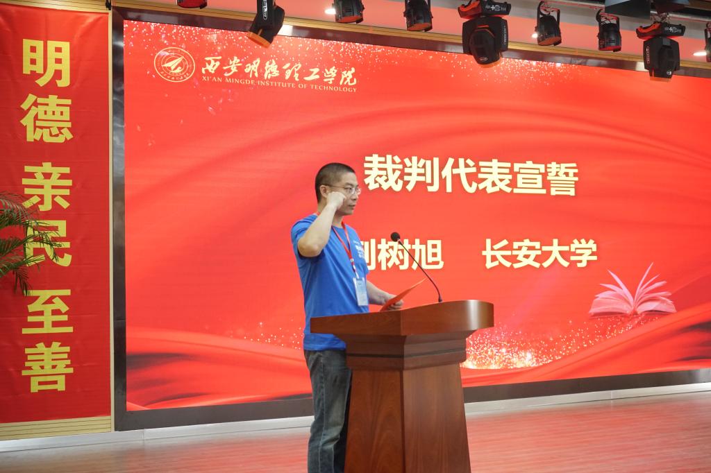 随后,西安交通大学陈业远同学代表参赛队员宣誓,西安邮电大学周元哲老师代表教练员讲话,长安大学荆树旭老师代表竞赛裁判员宣誓。