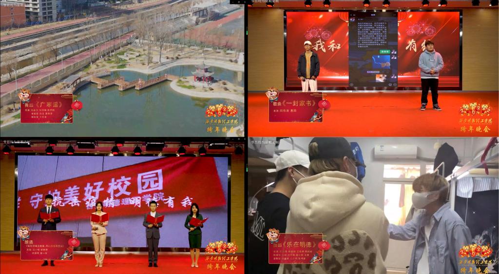 整场晚会节目形式丰富多样,精彩纷呈。校领导、中科院国家授时中心、羽毛球世界冠军和校内值守单位、校友代表等,以视频形式,通过云端为全校师生送上新年祝福。