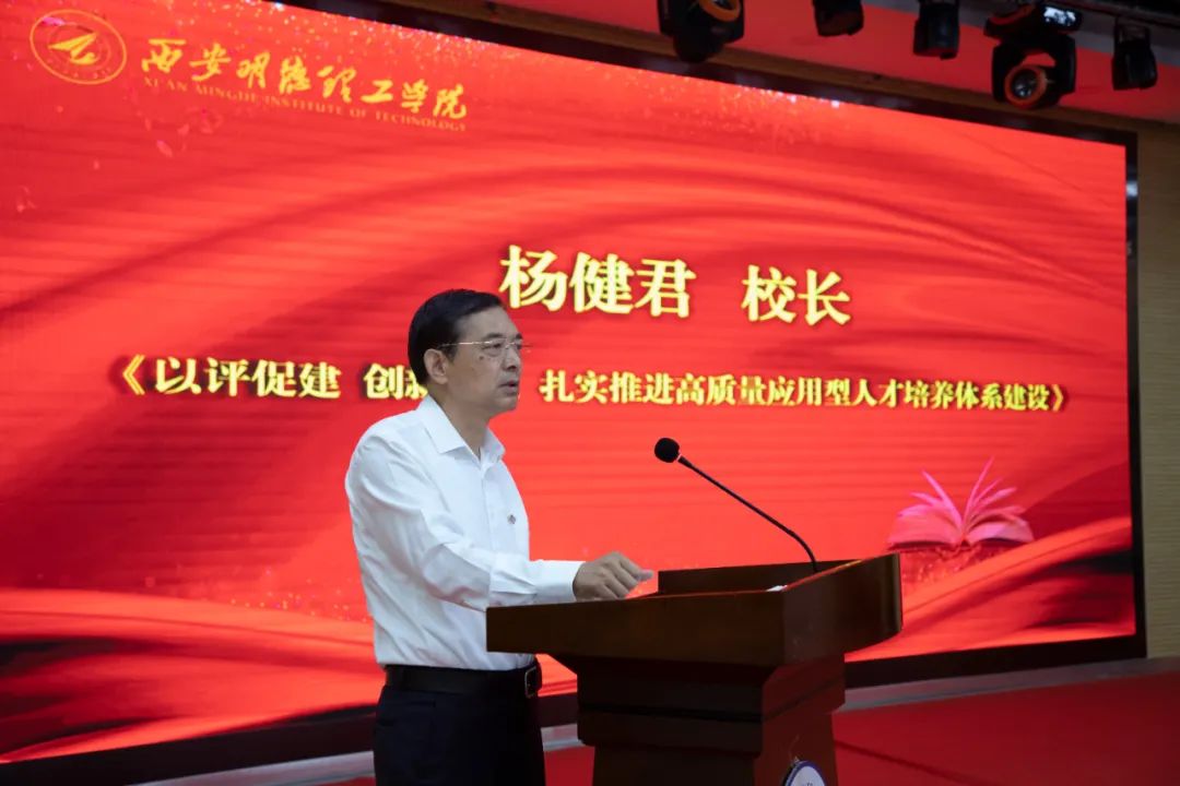 校长杨健君作了题为《以评促建 创新发展 扎实推进高质量应用型人才培养体系建设》的主题报告。他代表学校党政班子向全校教职工致以节日的诚挚问候和崇高敬意!向受表彰的先进个人表示热烈祝贺!同时,对教育科技集团、袁汉源董事长对广大教职工的慰问关心表示衷心感谢!他首先对上半年及暑期工作作了回顾和总结,同时分析了当前学校面临的主要形势。他指出,今年是学校实施“十四五”教育事业发展规划关键之年,也是本科教学工作合格评估建设的关键时期,围绕下半年重点工作,就是要贯穿本科合格评估一条主线,理顺两个管理体制机制、召开三个重要会议、落实四项重点工作任务。
