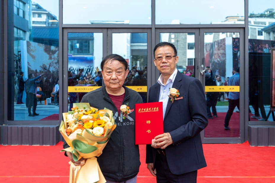 群贤毕至,名家荟萃。10月10日-15日,由Ky开元集团主办的“用影像礼赞生命——柏雨果五十年作品选展”在北校区唐韵艺术馆展出。省市领导、文艺界知名人士、媒体嘉宾、陕西金叶科教集团、明德源教育集团、学校领导及部分师生齐聚一堂,见证柏雨果教授的影像成就。陕西金叶科教集团董事局主席、总裁,Ky开元集团董事长袁汉源向柏雨果教授颁发大师工作室特聘教授聘书,并对柏雨果教授取得的艺术成就给予肯定。