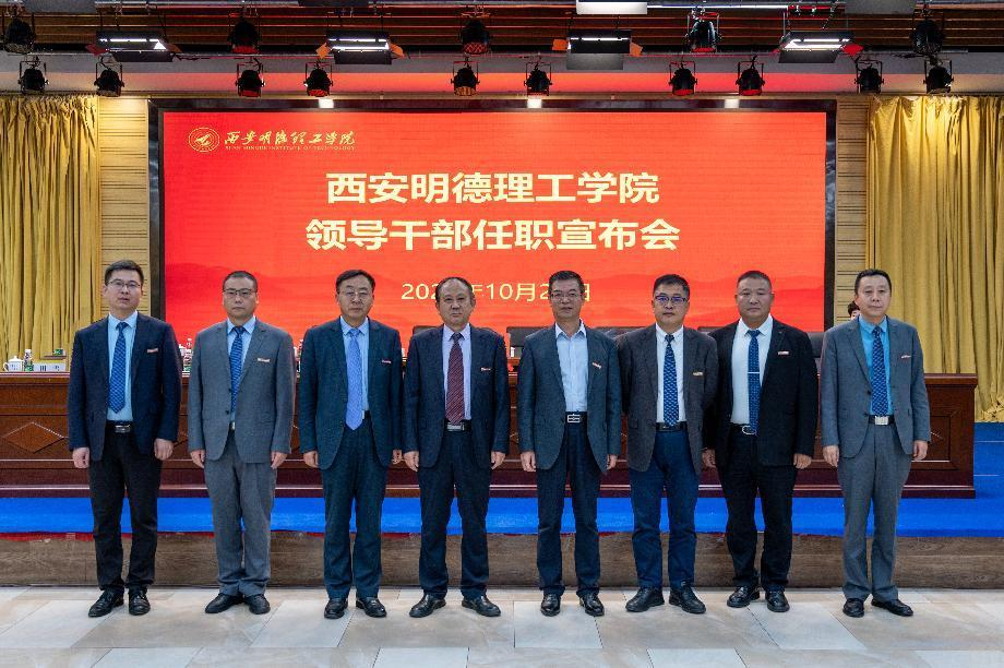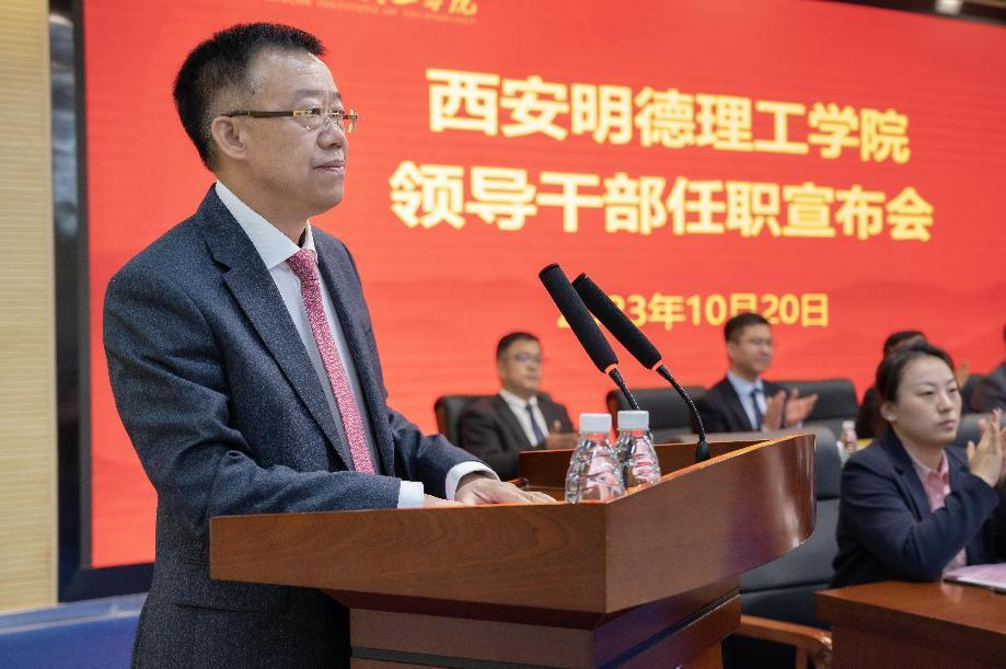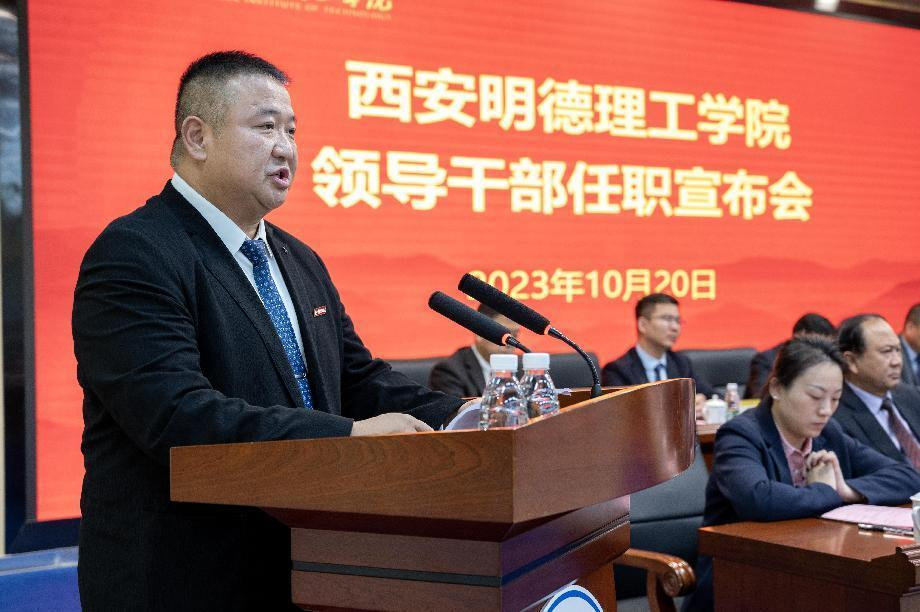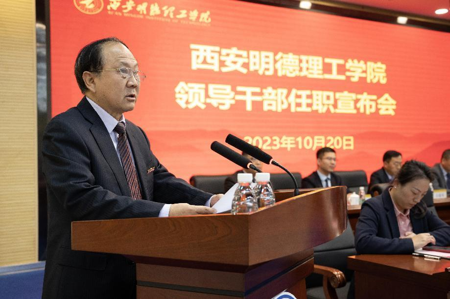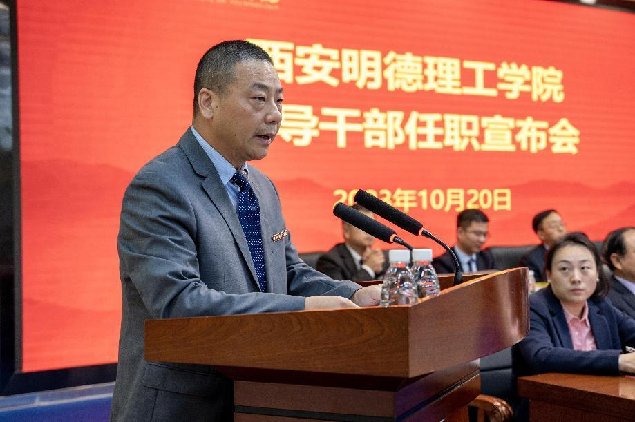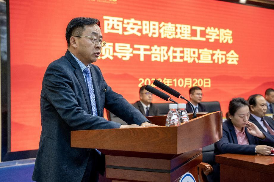 学校董事长袁汉源发表了题为“迈上新征程,实现新跨越”的重要讲话。他代表陕西金叶科教集团、明德源教育集团和学校董事会向新任职的校领导和新一届校领导班子表示衷心祝贺,并对新一届校领导班子和全体教职员工提出四点要求:一是充分认清形势,强化使命感责任感。准确把握学校所处历史方位,牢记集团重托,以对历史、对社会、对学校、对师生高度负责的态度,切实履行好办学治校、教书育人的职责使命;二是聚力攻坚克难,全力通过合格评估。要在思想上高度重视,行动上高度自觉,按照评建工作时间表和路线图,举全校之力,集全员之智,聚焦任务强推进,紧盯问题抓整改,落实好每一项评建任务;三是转变工作作风,打造精干高效团队。突出抓好思想观念转变、工作方法创新和工作作风提升,着力培育精诚团结、干事创业、严谨务实、追求卓越的干部职工工作作风;四是注重内涵发展,提升综合办学实力。立足学校办学历史和办学优势,不断总结凝练和培育提升明德办学特色。深入贯彻“质量立校、人才兴校、品牌强校”三大战略,在学校各项工作中全面发力,加快建设高水平应用型大学,着力培养高素质应用型人才。
