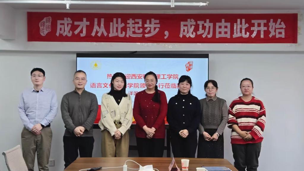 为贯彻国家人才培养改革要求,推进产教融合,2026年1月23日,语言文化传播学院副院长刘勇率英语、德语、翻译、日语四个专业的负责人赴译国译民西安分公司开展人才培养方案调研。译国译民西安分公司雍莉、杨谨两位经理参与交流。