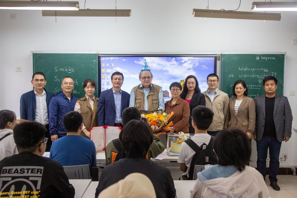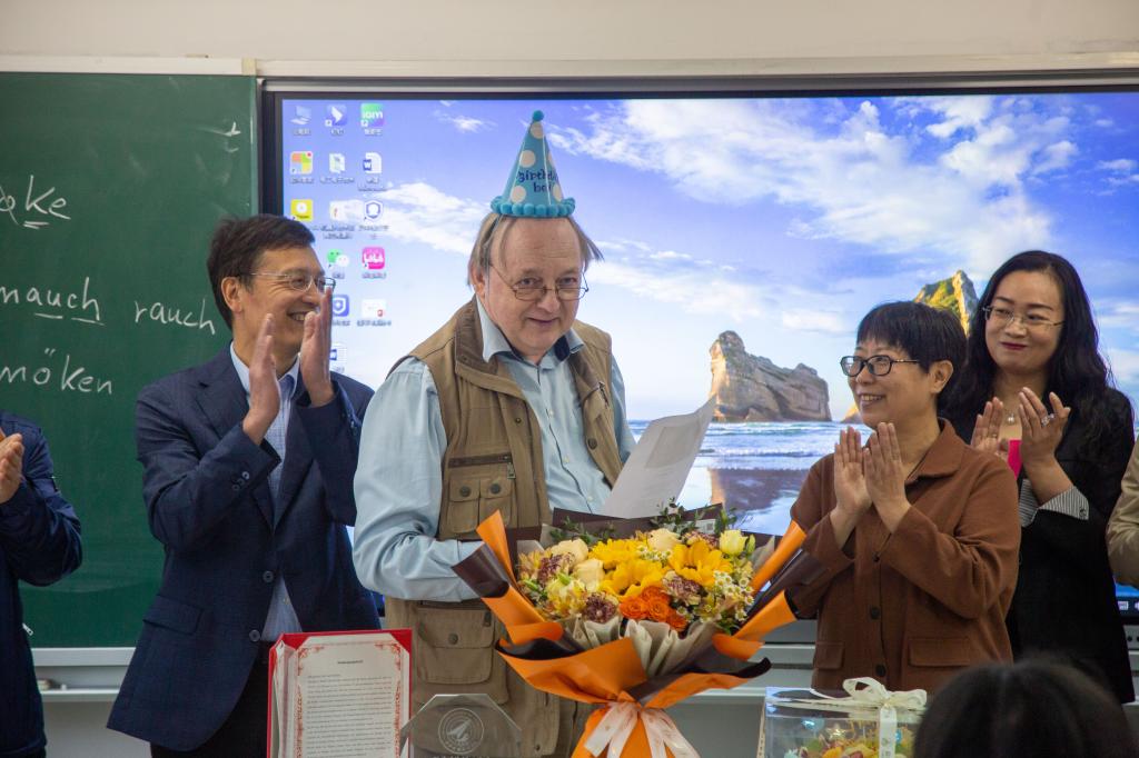 5月6日,开元德籍外教Lutz Schridde先生在师生们的祝福中,迎来了64周岁的生日。学校人力资源处副处长康抗、校工会办公室主任蔡文静、国际教育学院院长于艳英、语言文化传播学院领导班子和师生代表来到教室为Lutz送上祝福。