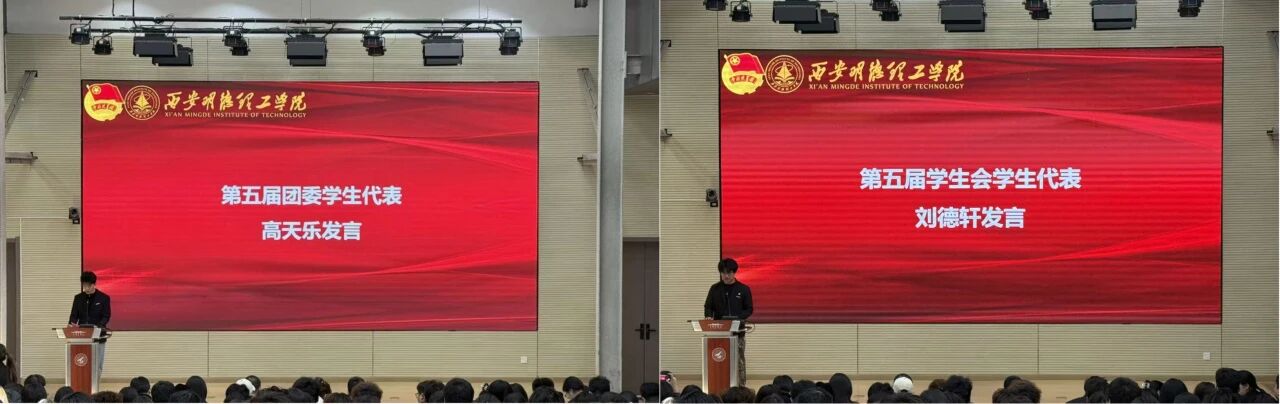 第五届团委学生代表高天乐、学生会学生代表刘德轩同学依次发言。他们向辛勤付出的老师和上一届学生干部致以崇高敬意,发言中,两位代表言辞恳切、满怀热忱,既表达了对学生工作的热爱,也展现了在未来将以更饱满的热情服务师生、助力学院发展的信心与决心。