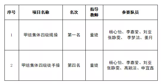 经过艰苦训练,同学们充分发扬了艰苦奋斗、勇于拼搏的体育精神。在激烈角逐中,开元在本次大赛中取得了“四级绳操”甲组全国第一名以及“四级徒手”甲组全国第四名的好成绩。