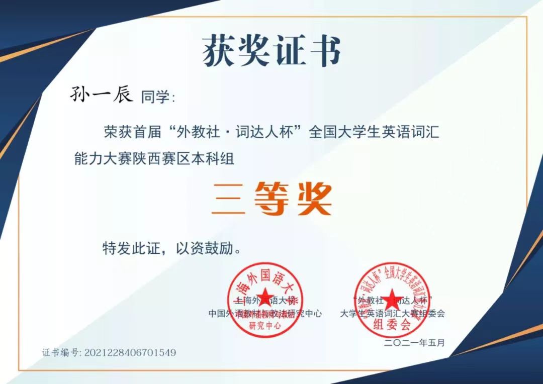 全国大学生英语词汇能力大赛陕西赛区三等奖;