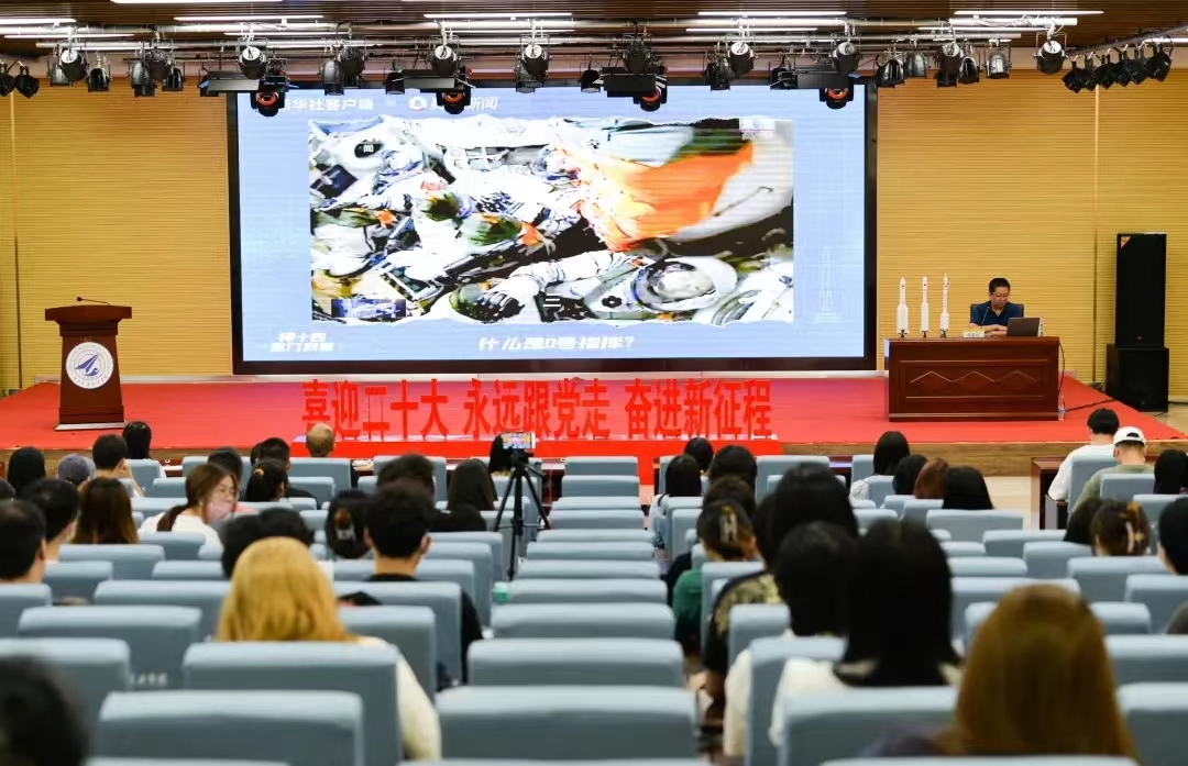 苟秉宸教授深入浅出、通俗易懂地讲解了我国航天人发奋图强,赶超世界的辉煌历程,细数世界航天发展史,特别是中国载人航天所取得的辉煌成绩,并纵观“两弹一星”精神、载人航天精神,引领同学们系统深入地理解航天精神的内涵。