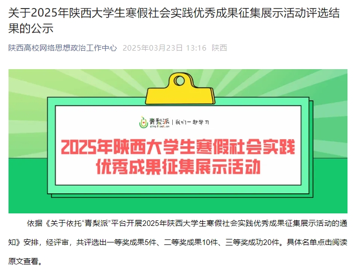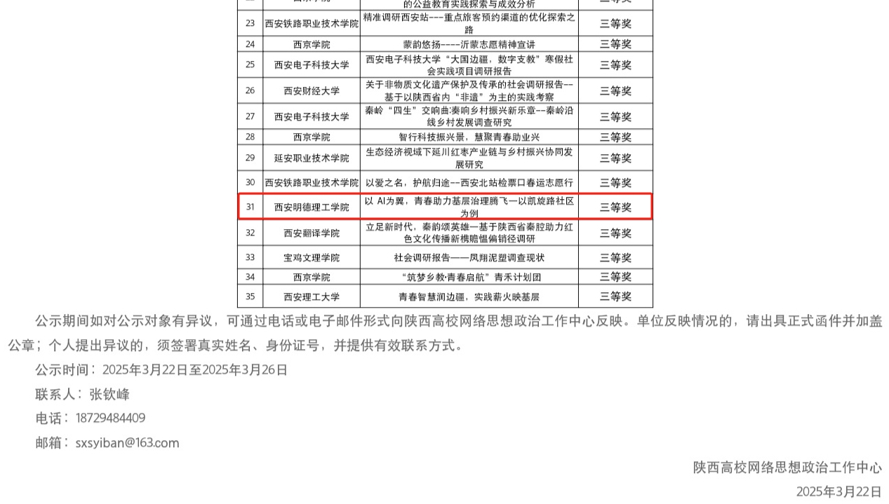 近日,陕西高校网络思想政治工作中心公示了2025年陕西大学生寒假社会实践优秀成果征集展示活动评选结果,本次活动依托教育部“青梨派”大学生自主学习思政课平台开展,共有68件作品进入评审环节,经评审,共评选出优秀成果35件,开元学生朱广琛提交的《以AI为翼,青春助力基层治理腾飞——以凯旋路社区为例》实践成果最终被认定为三等奖。