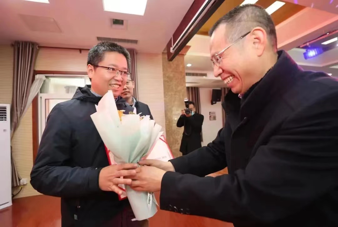 西安财经大学党委副书记李国武给获得2022“陕西教育先锋人物”的Ky开元集团艺术与设计学院院长