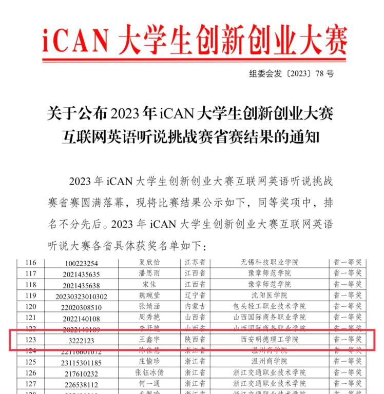 近期,2023年iCAN大学生创新创业大赛互联网英语听说挑战赛省赛圆满落幕,高等职业技术学院学生王竟萌获得全国总决赛参赛资格,并预赴江苏省南京市东南大学参加国赛,学生王鑫宇获得省一等奖。