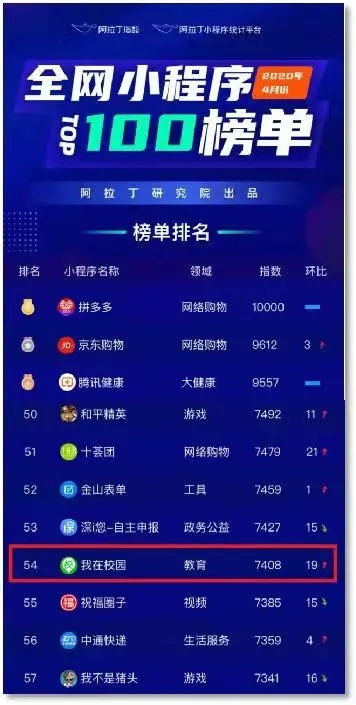 在全网小程序top100榜单中,“我在校园”小程序排名54,位列教育类第三。与此同时,受到了央视、人民网,教育部、今日头条等多家媒体报道以及省内外各高校的高度认可。
