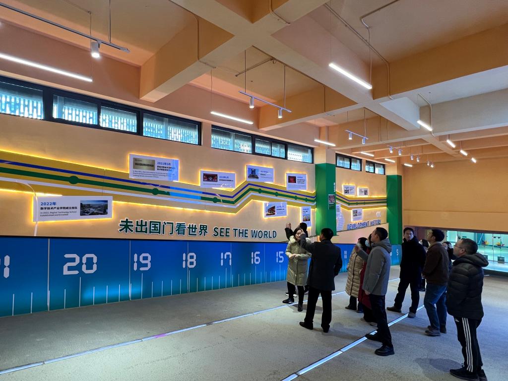 开元一行在软通动力集团助理副总裁黄倩的带领下,参观了院区包括学生宿舍、图书馆、智慧教室、实践教学实验室等相关设施场所。