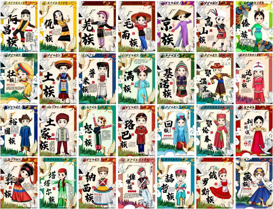 海报作品,一张张精心设计的民族主题海报依次排开,创作者们结合民族特色元素进行创作,画面色彩丰富、构图生动,将不同民族的服饰特点、民俗风貌以直观的方式呈现出来,每一张海报都凝聚着同学们对民族文化的细致观察与创意表达。