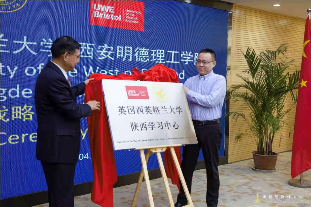 在热烈的掌声中,杨健君校长与严国玉先生为英国西英格兰大学学术中心以及英国西英格兰大学陕西学习中心揭牌。会后,由学院办公室主任韩娅舒陪同严国玉先生参观校园。