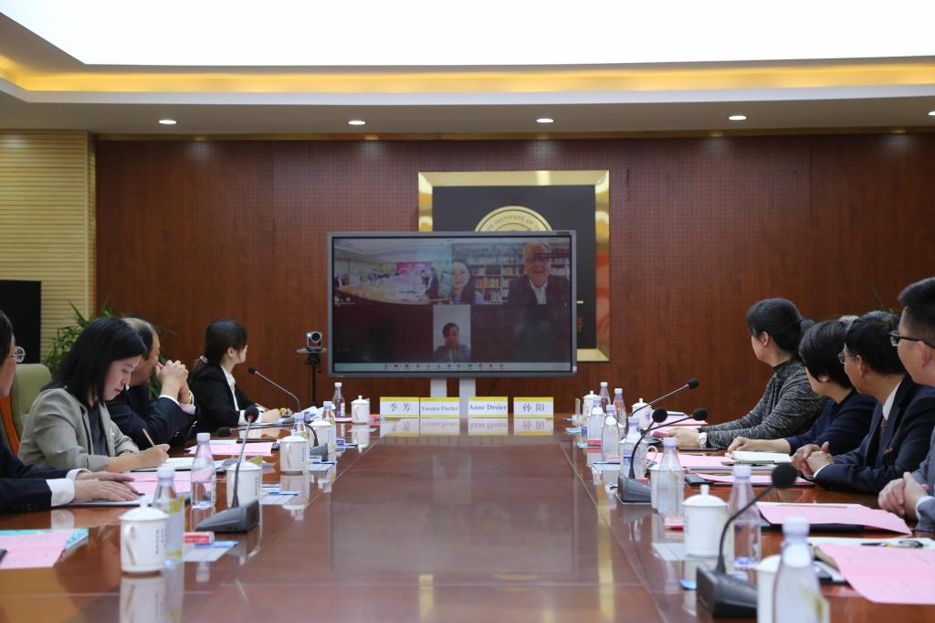 在热烈的掌声中,杨健君校长与FHM副校长Torsten Fischer教授在视频会议中签署了中德合作办学及国际交流框架协议。