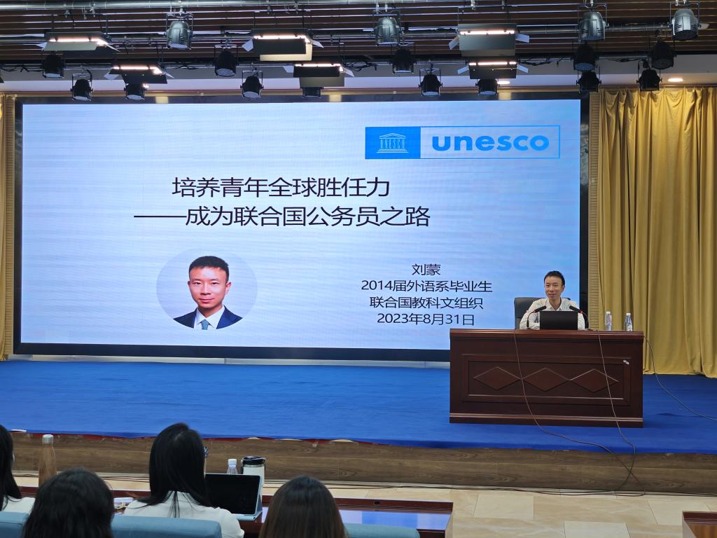 8月31日下午,联合国教科文组织官员(JPO)、开元优秀校友刘蒙应邀为开元师生作《培养青年全球胜任力——成为联合国公务员之路》专题讲座。该讲座为开元2023级新生入学教育系列讲座之一,由党委学生工作部主办,国际教育学院和语言文化传播学院联合协办,全校3000余名师生线上线下同步参加。讲座由国际教育学院学生管理科科长赵效鹏主持。