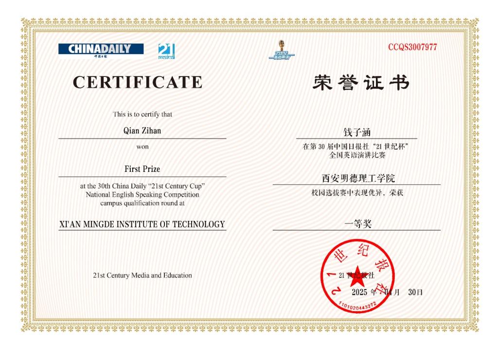 “21世纪杯”全国英语演讲比赛由中国日报社、21世纪英语教育传媒联合主办,自1996年创办以来始终为国际公众演讲比赛(IPSC)中国区唯一选拔平台,并入选《全国普通高校大学生竞赛分析报告》竞赛目录。李克强总理的口译员、外交部翻译司英文处处长孙宁,央视英文频道知名主持人刘欣等大批人才均为该赛事获奖选手。此次SQA班学生钱子涵在该赛事中获奖,体现了开元国际教育学院近年来的人才培养成效;未来,学院将继续秉持秉承开放办学理念,为打造“国际化、个性化”的人才培养平台持续发力。