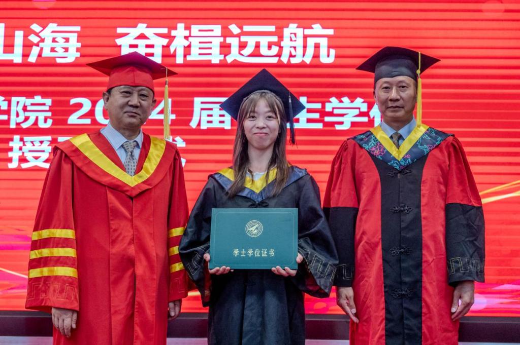 学位授予仪式开始。学校校长王志刚教授、校学位评定委员会委员翟书颖教授、陈世亮教授,学院副院长范晖教授为毕业生拨穗正冠并颁发学位证书。同学们依次上台并合影留念。
