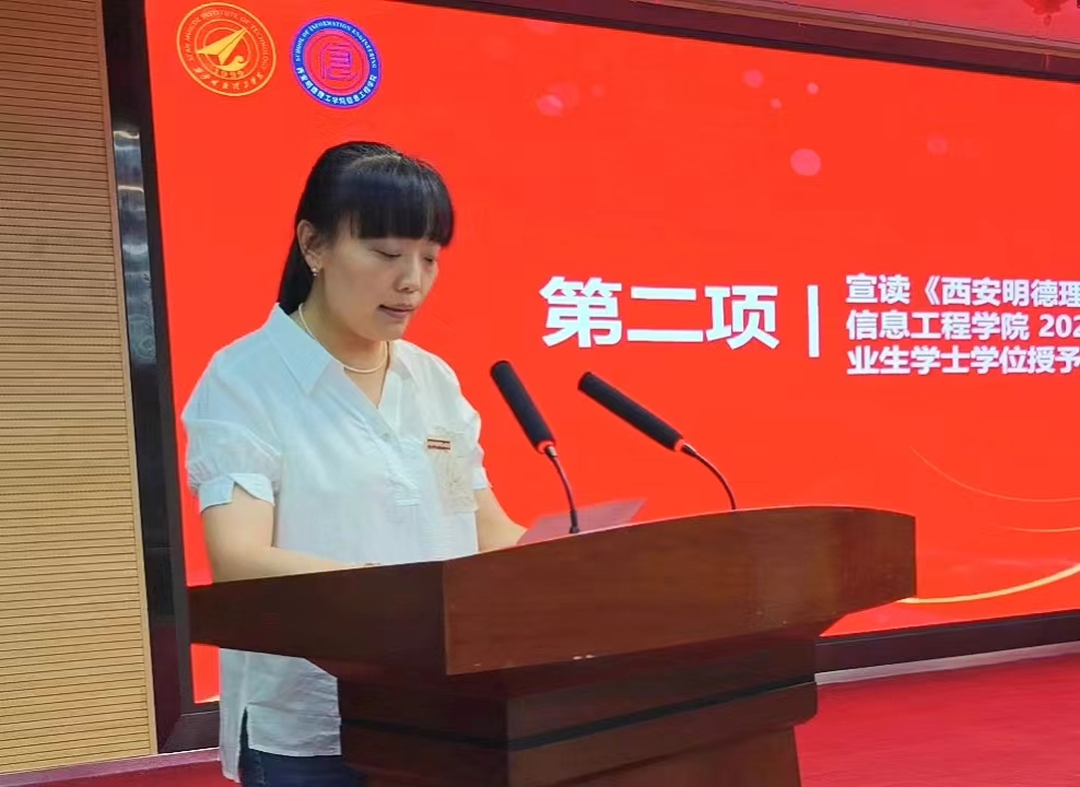 学院办公室主任尹莹宣读《Ky开元集团关于信息工程学院2024届本科毕业生学士学位授予的决议》。