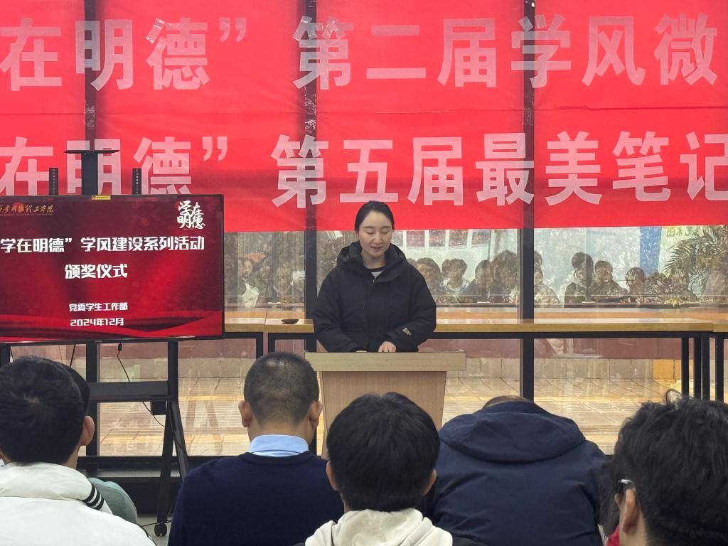颁奖仪式上,党委学生工作部花芸首先对获奖学生表达了诚挚的祝贺,并高度评价了此次学风微电影大赛和“最美笔记”评选活动,认为这是同学们自我展示、交流思想的宝贵机会。她鼓励同学们继续发扬优良学风,勤奋学习,勇于探索,带动周围同学共同进步,携手前行在学习的征途上。