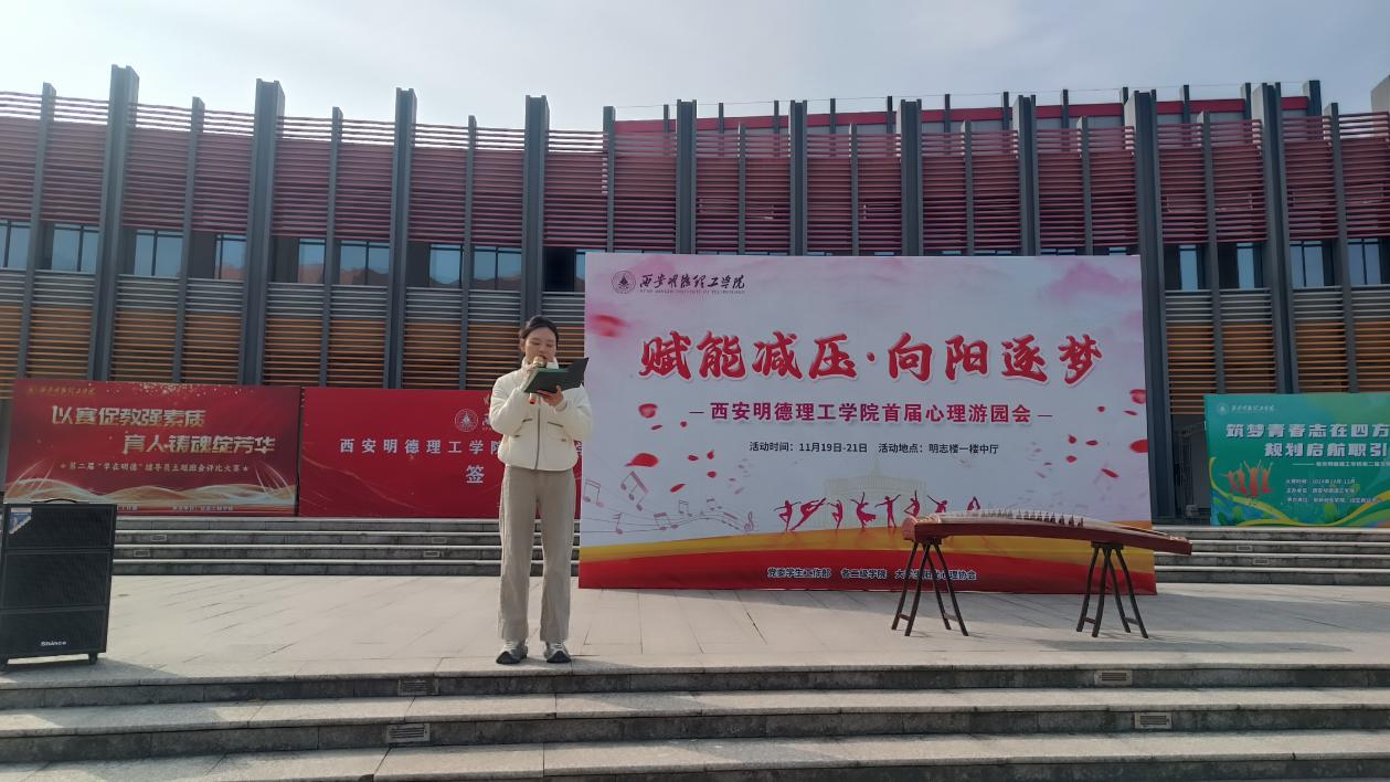在心理游园会开场仪式上,刘庭瑜同学表演了歌曲《明天你好》《不要忘记我爱你》,刘彦廷同学表演了古筝演奏《高山流水》,智能制造与控制技术学院辅导员王培茹宣读了本次心理游园会的活动目的和活动流程。