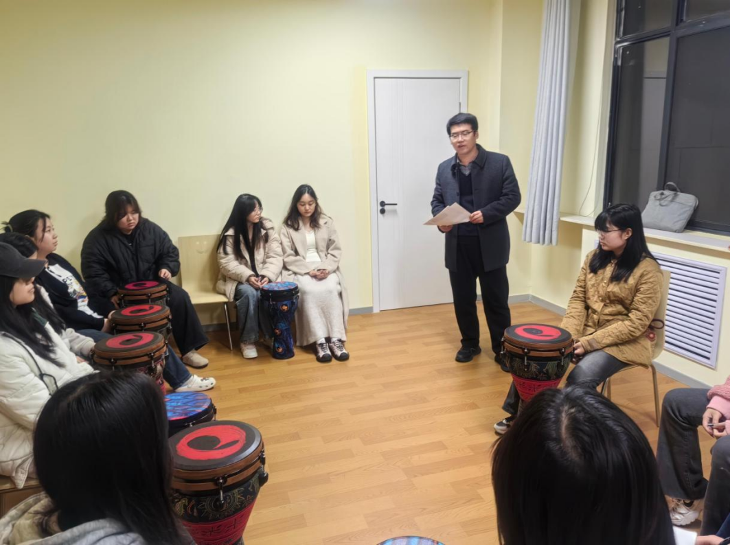 10月27日晚,大学生心理健康教育中心专职心理咨询师郭学鹏于在明心楼南202正念训练室带领学生开展了“正念听歌,音乐赋能”团体心理辅导活动。本次活动分为非洲鼓初体验、正念听歌、正念冥想训练三个阶段进行。团体领导者带领参与成员以歌曲《漫步人生路》为节奏,欢快地敲着非洲鼓,沉浸体验了非洲鼓这一打击乐的独特魅力。通过“数息练习”放松,正念聆听《风吹麦浪》(李健)、《光阴的故事》(罗大佑)等歌曲,参与学生脸上露出灿烂的笑容,体验到了轻松愉快,平日忙于学业的疲惫消失殆尽。