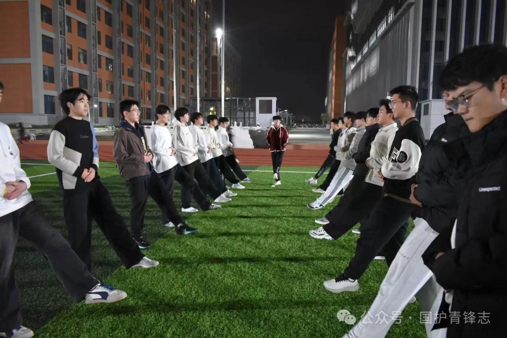 相比周三的训练,这次训练更显严谨有序。全员以站军姿开启状态调整,在挺拔的姿态中锤炼意志力,为后续动作训练筑牢根基。随后,大一大二队员共同投入升旗动作训练,大二队员担当标兵,以标准规范的动作示范引领,大一队员紧跟节奏、细致打磨。全体队员凝心聚力,全力为次日的训练做好充分准备,尽显国护队伍的团结与专业风采。