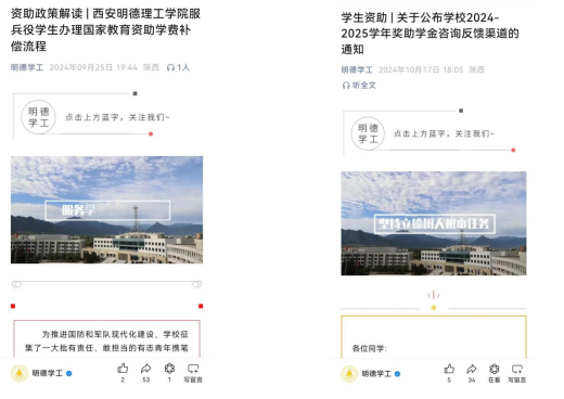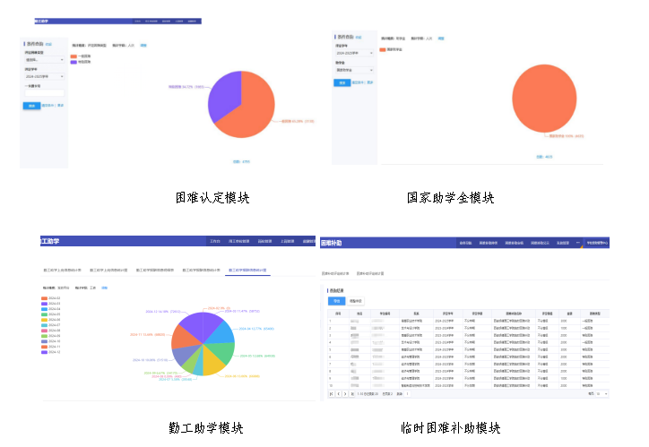学校积极推进融合门户学工系统的学生资助模块数字化应用,现已实现奖、助学金、勤工助学、临时困难补助资助工作的线上申报、查询与管理。用工单位、学生可以通过明德app线上申报勤工助学岗位并查看薪资情况,规范勤工助学流程,用工需签订勤工助学三方协议书、工作承诺书等。遇到临时困难时学生可以第一时间线上申请得到帮助,减少等待环节。通过数字化手段,资助工作实现了精准化和高效化,极大提升了工作效率和学生满意度。