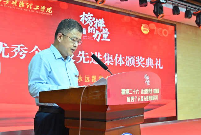 党委书记阎东明代表学校对受到表彰的先进集体和优秀个人表示热烈的祝贺,向长期以来辛勤付出的各位老师表示崇高的敬意和衷心的感谢,同时向同学们提出了三点希望:希望同学们坚持理想,志存高远。只有志存高远、坚毅果敢,不断在平凡的环境中淬炼不平凡的理想,才能真正成为有理想、有胆魄、有才华的优秀人才;希望同学们珍惜光阴,不负韶华。青年是学习的黄金时期,学习是青年的首要任务,“业精于勤而荒于嬉”,同学们正处于学习的黄金时期,应该把学习作为首要任务,惜时如金,刻苦学习;希望同学们修身明德、砥砺品性。品格是世界上最强大的动力之一,它是人生的支撑、生命的脊梁。一个品格高尚的人,可能不是最有权势和最有影响的人,但却因其高贵的品行而赢得最多的尊重,也必将成为拥有光明未来的人。