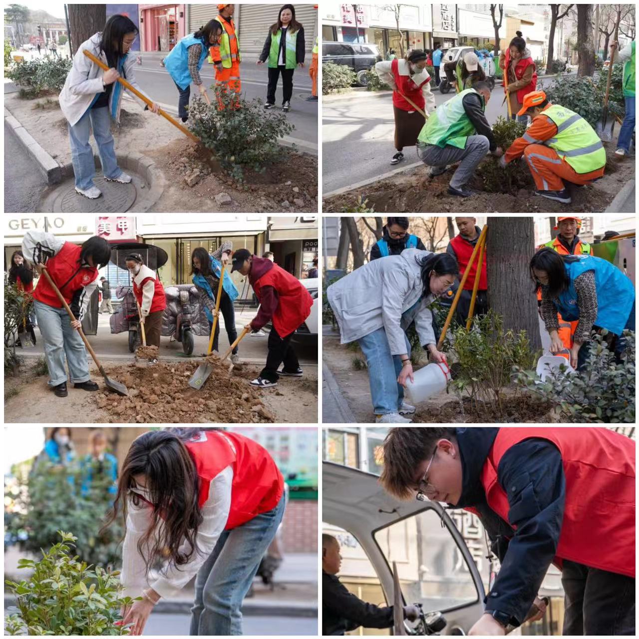 在学生党支部老师的带领和社区工作人员的指导下,学生党员们热情高涨、干劲十足,大家分工明确,齐心协力,撸起袖子加油干,共同完成挖坑、栽种树苗、填土、浇水等步骤,在相互帮助、不断实践中高效的完成栽种树苗的任务,呈现出一派热火朝天的劳动场面。