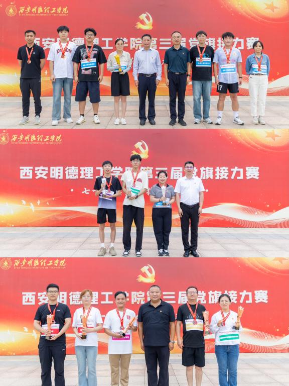 本次党旗接力赛以“授旗、传旗、赛旗”的形式开展,设有“思想筑基”“齐心协力”“红心向党”“信仰传承”“评建冲刺”5个赛段,比赛现场还设有“知识答题区”,全校师生均可参与。伴随一声发令枪响,选手们高举党旗从起点冲出,在此起彼伏的呐喊助威声中完成了党旗的交接、传递。经过激烈的角逐,信息工程学院党委“薪火相传先锋队”获得一等奖;信息工程学院党委“红色筑梦队”、智能制造与控制技术学院党委“智控3队”、明德科技职业学院党总支“科职队”获得二等奖;智能制造与控制技术学院党委“智控2队”、语言文化传播学院党委“语党同心·传旗飞扬代表队”、艺术与设计学院党委“青春心向党队”、机关党委“红星闪耀队”“后勤先锋队”获得三等奖。
