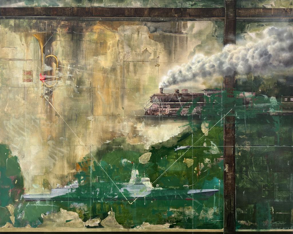 三个主体物军号、火车、战机与军舰——在画布上巧妙布局,他们分别在中国地图中占据了三个点位,形成了一个稳定的三角形结构。这个三角形不仅在视觉上提供了平衡和稳定性,而且在象征意义上,它传达了团结、坚韧和持续进步的信息。这种设计同时也隐含了历史、现在和未来三者间的内在联系,强调了中国共产党带领全国人民走过的风雨历程,及其为未来奠定的坚强基石。作品浓缩展示了中国共产党的历史和成就,也体现了本人对这一历史过程的深刻理解和艺术感悟。通过这幅作品,体现一个时代缩影、一个民族记忆、一段情感寄托,是对过去的回顾,对现在的反映,也是对未来的憧憬。谨以此作品敬献给中华人民共和国成立75周年!