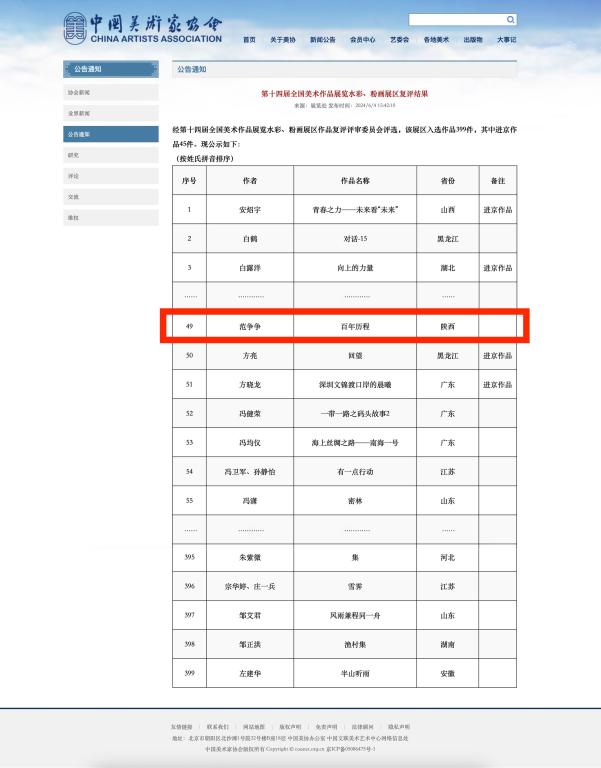 6月4日下午,由文化和旅游部、中国文学艺术界联合会、中国美术家协会共同主办的“第十四届全国美术作品展览”通过中国美协官网公布“水彩、粉画展区复评结果”,经评审委员会评选,该展区全国范围最终入选作品共399件(其中陕西省2件)。开元艺术与设计学院专任教师范争争的水彩作品《百年历程》经过严格初评、复评光荣入选!