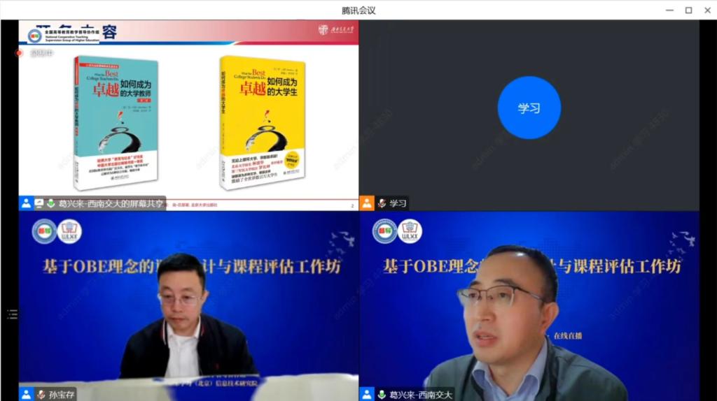 近期,质量管理与评估办公室组织10位校级教学督导在线上参加了由全国高等教育教学督导协作组举办的“基于OBE理念的课程设计与课程评估专题培训会”。两天的培训会分别由西南交通大学国家级教学名师冯晓云教授团队进行了五个不同主题的报告,包括专题主旨报告、“OBE理念下跨学科交叉融合的反向教学设计与实践”、“基于OBE理念的电气专业类课程教学设计与实施”、“基于OBE混合式教学的技术逻辑和教学实践”、“OBE混合教学之课程自组织模式设计与实践”。冯晓云教授团队从教学创新改革顶层设计思路讲起,选取跨学科课程、电气专业类课程、混合式教学课程三类具有代表性的课程类型,详细阐述了基于OBE理念如何进行教学设计,利用怎样的教学策略和教学模式以及如何达成育人成效。