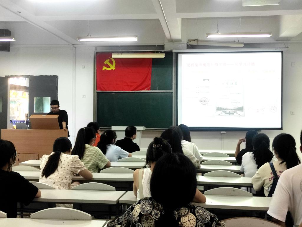 会议伊始,罗夫惠老师从党员组织关系转接流程、转接方式及注意事项等三个方面向全体毕业生党员解读了2022届毕业生党员组织关系转接相关事宜;紧接着,毕业生党员代表薛少轩和李恒两人依次从思想觉悟提升、党员先锋作用发挥、大学收获与感想等方面分享了在党组织培养下个人的成长故事,他们的精彩分享赢得现场师生的阵阵掌声;冯纪潮老师从文明离校和离校前工作安排两个方面为同学们做了毕业教育,并通报近期毕业生相关工作安排;何文举老师从共产党员为什么要坚定理想信念、共产党员怎样做到坚定理想信念、青年党员如何践行初心使命等三个方面为毕业生党员们讲了主题为“坚定理想信念,践行初心使命”的党课;最后,罗夫惠带领在场的全体党员重温入党誓词。